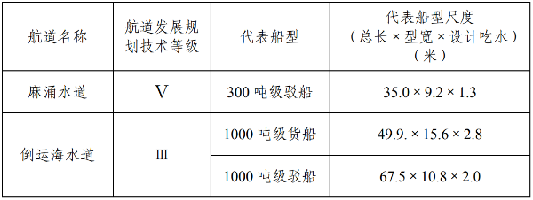 (一)代表船型基本同意《东莞市麻涌镇中心大道中压天然气管道工程穿越麻涌水道、淡水河大桥中压天然气管道工程穿越倒运海水道航道通航条件影响评价报告》(以下简称《航评报告》)论证提出的工程所处河段的航道发展规划技术等级和代表船型,详见表1。