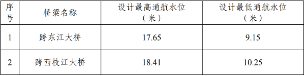 《航评报告》关于设计通航水位的评价结论合理。桥梁跨越航道处的设计最高、最低通航水位(1985国家高程基准,下同)详见表2。