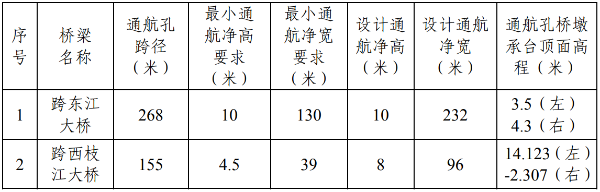 (三)通航净空尺度拟建桥梁均采用单孔双向通航方案,《航评报告》论证提出的拟建桥梁最小通航净空尺度的结论,以及设计方案提出的各桥梁实际通航净空尺度满足通航要求,详见表3。