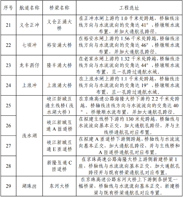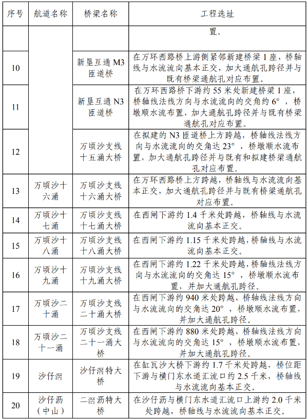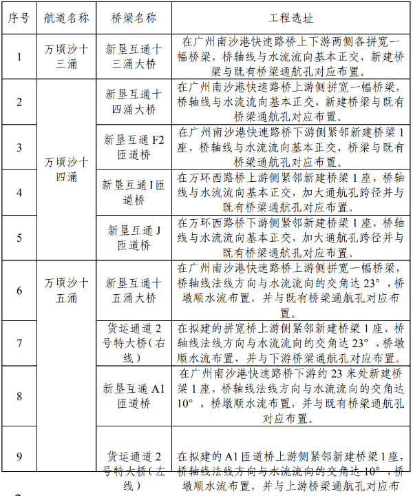南沙至中山高速公路起于广州市南沙区万顷沙镇,终于中山市港口镇,由主线和万顷沙支线两部分组成,全长约32公里,拟跨越17条航道(不含先行工程),建设29座桥梁。拟建工程位于珠江三角洲河网地区,大部分桥梁建于联围内,各桥梁所处河段河势总体稳定,水流条件较好。但部分其桥梁轴线法线方向与水流流向交角较大,不满足《内河通航标准》等要求。综合考虑选址的相关因素,在采取合理加大通航孔跨径或一孔跨过通航水域、桥墩顺水流布置等措施的前提下,桥梁选址对航道通航条件的影响总体可控,详见表1。