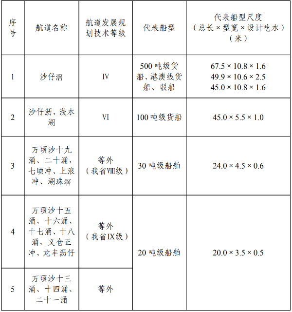 (一)代表船型根据《广东省航道发展规划(2020-2035年)》,《南沙至中山高速公路工程航道通航条件影响评价报告》(以下简称《航评报告》)论证采用桥梁所处河段的航道发展规划技术等级和代表船型合理,详见表2。