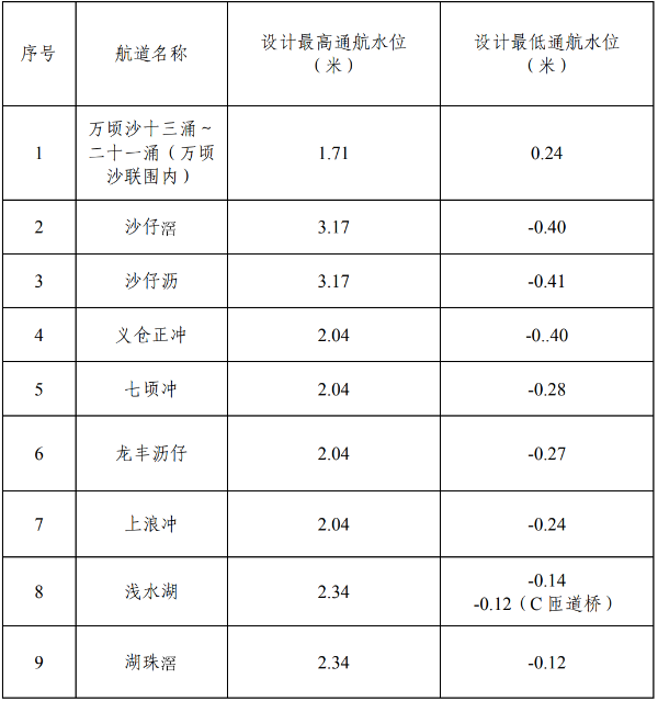 (二)设计通航水位《航评报告》关于设计通航水位的评价结论合理。桥梁跨越航道处的设计最高、最低通航水位(1985国家高程基准,下同)详见表3。
