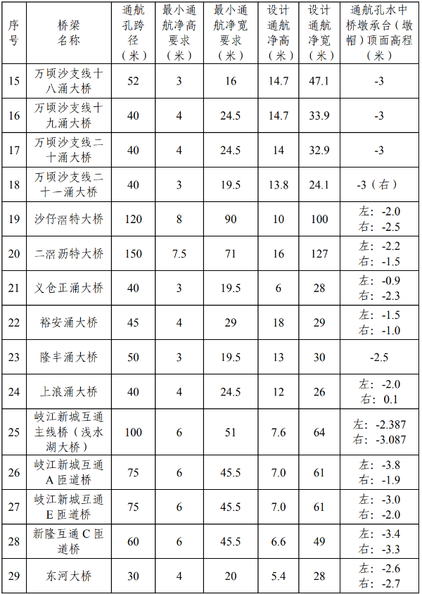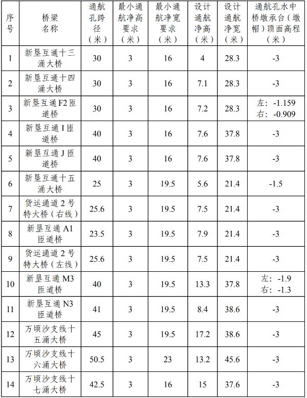(三)通航净空尺度拟建桥梁均采用单孔双向通航方案,《航评报告》论证提出的拟建桥梁最小通航净空尺度的结论,以及设计方案提出的各桥梁实际通航净空尺度满足通航要求,详见表4。