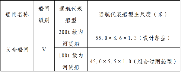 船闸名称 船闸级别 通航代表船型 通航代表船型主尺度(米)义合船闸 Ⅴ 300t级内河货船 55.0×8.6×1.3(设计船型) 100t级内河货船 45.0×5.5×1.0(组合过闸船型)