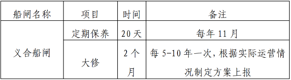 义合船闸日运行时间8小时,每天9:00-17:00。如确有必要可根据船舶实际过闸需求延长运行时间。