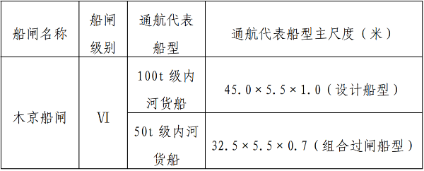 一、船闸基本情况:木京船闸位于河源市东源县仙塘镇龙利村,由河源清源木京水电站有限公司负责管理。船闸2003年建成通过验收。船闸按内河Ⅵ级航道、通航100吨级船舶标准设计,设计年通过能力111万吨。闸室有效尺度为:100.0×14.0×2.3(长×宽×门槛最小水深,单位米),设计最大通航100吨级船舶。