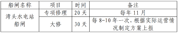 原则上船闸修理时间不得超过上表时间安排。船闸修理期间应优化船闸修理方案,尽量缩短停航时间,减小对通航的影响。