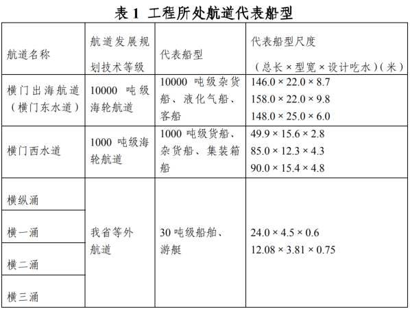 根据《广东省航道发展规划(2020-2035年)》及其他相关文件,《翠亨新区滨河整治水利工程(北部标段第二阶段水利工程)航道通航条件影响评价报告》(以下简称《航评报告》)论证选用的代表船型合理,详见表1。