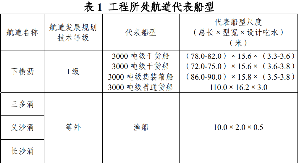 (一)代表船型根据《广东省航道发展规划(2020-2035年)》及其他相关文件,《广州南沙新区明珠湾区起步区二期(横沥岛尖)南段海岸及滨海景观带建设工程航道通航条件影响评价报告》(以下简称《航评报告》)论证选用的代表船型合理,详见表1。
