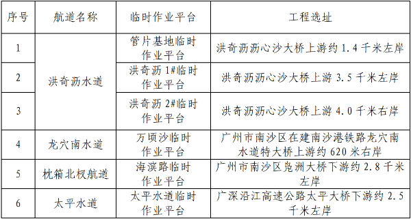 深江铁路施工临时作业平台工程拟设置6个施工临时作业平台。广州市、东莞市、中山市等相关部门已明确施工临时作业平台工程选址,且仅用于运输深江铁路施工所需建筑材料、隧道管片海上运输和弃土外运等,使用期限从2021年12月至2026年12月,约5年。工程所处河段河道均较顺直,河面宽阔,水深条件良好,河床、河势基本稳定。综合考虑航道通航条件和工程使用要求,在落实相关安全保障措施的条件下,工程选址对航道通航条件的影响可控。详见表1。
