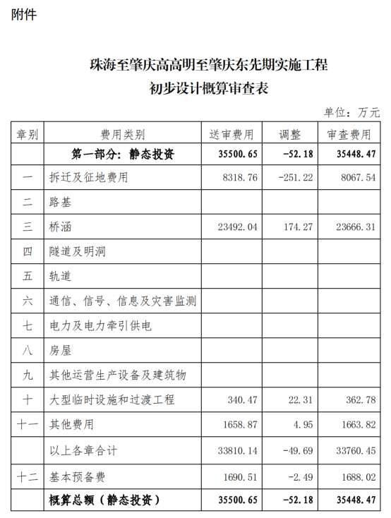 附件:珠海至肇庆高高明至肇庆东段先期实施工程初步设计概算审查表