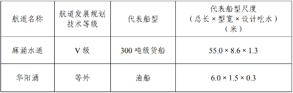 (一)代表船型根据《广东省航道发展规划(2020—2035年)》,《华阳村前涌路及其配套工程航道通航条件影响评价报告》(以下简称《航评报告》)论证选用的代表船型合理,详见表1。