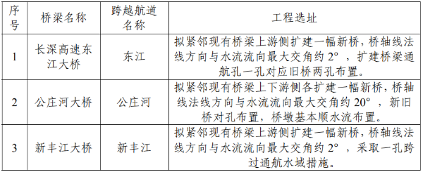 长春至深圳国家高速公路河源热水至惠州平南段改扩建工程位于河源、惠州市,拟对跨越东江、公庄河、新丰江的桥梁进行扩建。拟扩建桥梁所处河段岸线、河势基本稳定,水流条件良好,部分桥梁选址不满足《内河通航标准》要求。综合考虑选址的相关因素,在妥善处理好工程建设、运营、保护与相邻涉水设施相互影响,桥梁采取适当加大通航孔跨径或一孔跨过通航水域等措施的前提下,基本同意设计提出的各跨河桥梁的选址方案,详见表1。