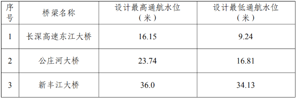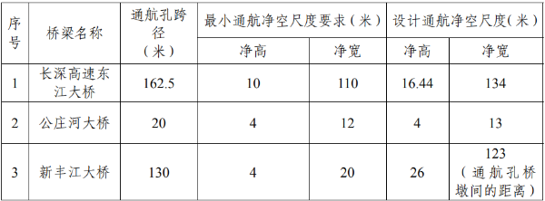 (三)桥梁通航净空尺度基本同意《航评报告》论证提出的拟建桥梁最小通航净空尺度要求,设计提出拟扩建的长深高速东江大桥、公庄河大桥、新丰江大桥分别采用单孔双向、双孔单向、单孔双向通航方案,实际通航净空尺度(通航净宽为垂直水流方向投影的净宽)均大于最小通航净空尺度,满足通航要求,详见表4。