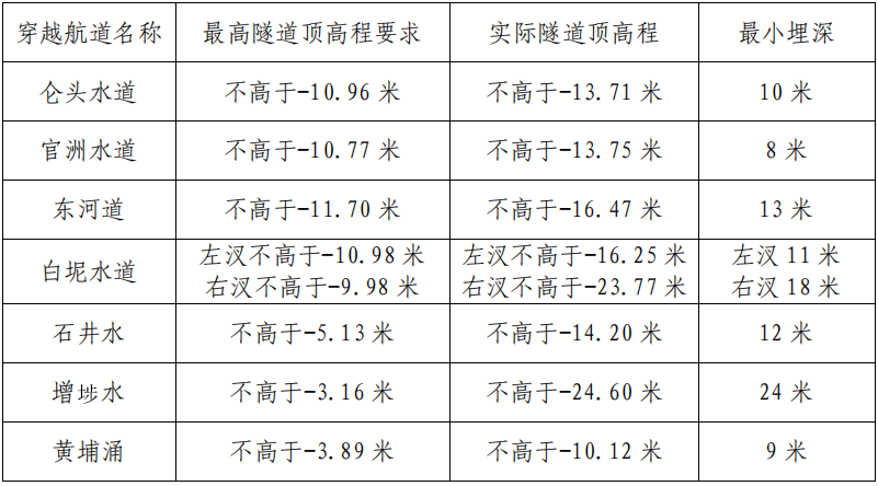 基本同意《航评报告》关于拟建隧道埋置深度(详见表3)的评价结论。拟建隧道均埋置于河床内,出入土点均位于岸上,埋设满足通航要求。