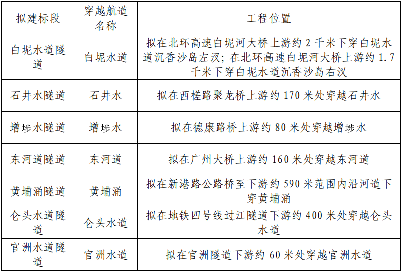 广州市城市轨道交通十二号线工程起于浔峰岗站,终止于大学城南站,线路全长37.6千米,均为地下隧道。工程拟采用盾构隧道方式穿越白坭水道、石井水、增埗水、东河道、黄埔涌、仑头水道和官洲水道,工程位置详见表1。工程所处河段水深和水流条件良好,河床、河势总体稳定,综合考虑航道通航情况和隧道建设条件,原则同意工程选址。