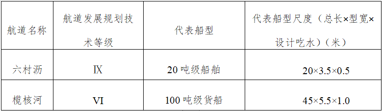 根据《广东省航道发展规划(2020-2035年)》及相关文件,《广东东泰乳业有限公司懋源云1号、2号专用综合房外电工程电缆管线穿越六村沥、榄核河航道通航条件影响评价报告》(以下简称《航评报告》)论证选用的代表船型合理,详见表1。