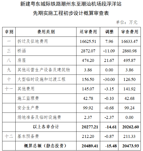 加拿大28官网 关于粤东城际铁路潮州东至潮汕机场段项目浮洋站先期实施工程初步设计的批复