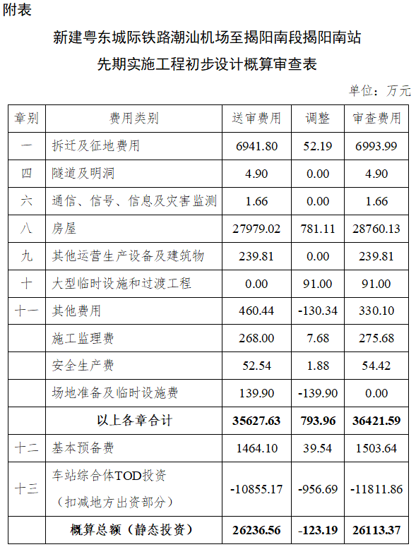 经审查,核定揭阳南站先期实施工程设计概算(工程静态投资)为26113.37万元,各章节费用组成详见附件。