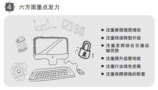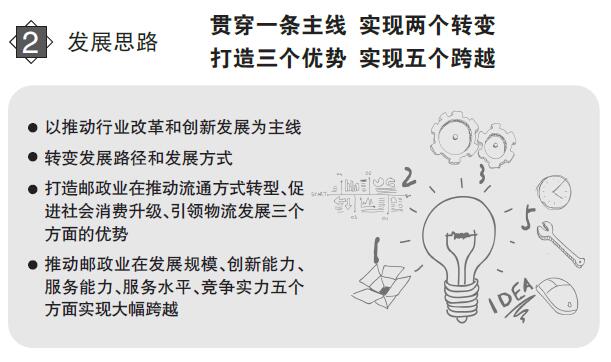 三是全面描绘行业发展蓝图。《规划》提出的奋斗目标是:到2020年,全面建成与小康社会相适应的现代邮政业,推动我国由邮政大国向邮政强国迈进。基于此,《规划》提出推动行业发展的基本思路是:贯穿一条主线,实现两个转变,打造三个优势,实现五个跨越。就是以推动行业改革和创新发展为主线,转变发展路径和发展方式,打造邮政业在推动流通方式转型、促进社会消费升级、引领物流发展三个方面的优势,推动邮政业在发展规模、创新能力、服务能力、服务水平、竞争实力五个方面实现大幅跨越。