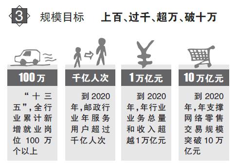 发展仍是邮政业面对的基本问题,行业只有持续快速发展,才能满足不断增长变化的服务需求。《规划》在发展规模方面提出“上百、过千、超万、破十万”的目标。具体来讲,就是“十三五”期间,全行业累计新增就业岗位100万个以上;到2020年,邮政行业年服务用户超过千亿人次,年行业业务总量和收入超越1万亿元,年支撑网络零售交易规模突破10万亿元。同时,《规划》明确了创新能力、服务能力、服务水平、竞争实力等方面的目标,着力推动行业提升发展质量和水平。