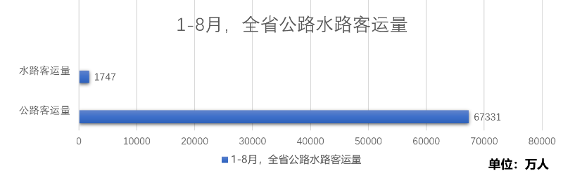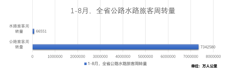 1-8月,全省公路水路客运量和旅客周转量分别完成69078万人和7409131 万人公里,同比分别下降4.1%和2.2%,其中公路客运量和旅客周转量分别完成67331万人和7342580 万人公里,同比分别下降4.1%和2.1%;水路客运量和旅客周转量分别完成1747万人和66551万人公里,同比分别下降6.0%和11.7%。