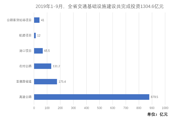 2019年1-9月,全省交通基础设施建设共完成投资1304.6亿元,为年度计划的87.0%,同比增长15.1%。公路项目完成投资1186.1亿元,为年计划的87.2%,同比增长15.6 %,其中,高速公路完成投资879.5亿元,为年计划的85.4%,同比增长10.2%;普通国省道完成投资175.4亿元,为年计划的97.5%,同比增长45.6%;农村公路完成投资131.2亿元,为年计划的87.5%,同比增长22.2%。港口项目完成投资65.5亿元,为年计划的93.6%,同比增长8.6%。航道项目完成投资12.0亿元,为年计划的120.1%,同比下降28.1%。公路客货站场项目及其他完成投资41.0亿元,为年计划的68.3%,同比增长32.2%。