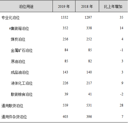 全国万吨级及以上泊位中,专业化泊位1332个,比上年增加35个;通用散货泊位559个,增加28个;通用件杂货泊位403个,增加7个。