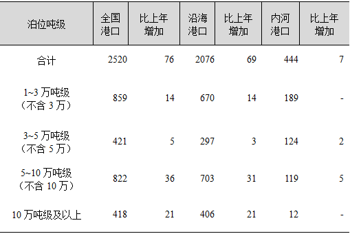 年末全国港口拥有万吨级及以上泊位2520个,比上年增加76个。其中,沿海港口万吨级及以上泊位2076个,增加69个;内河港口万吨级及以上泊位444个,增加7个。
