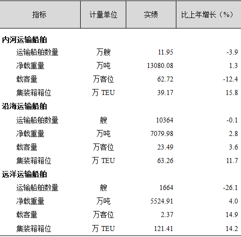 年末全国拥有水上运输船舶13.16万艘,比上年下降4.0%;净载重量25684.97万吨,增长2.3%;载客量88.58万客位,下降8.0%;集装箱箱位223.85万标准箱,增长13.8%。