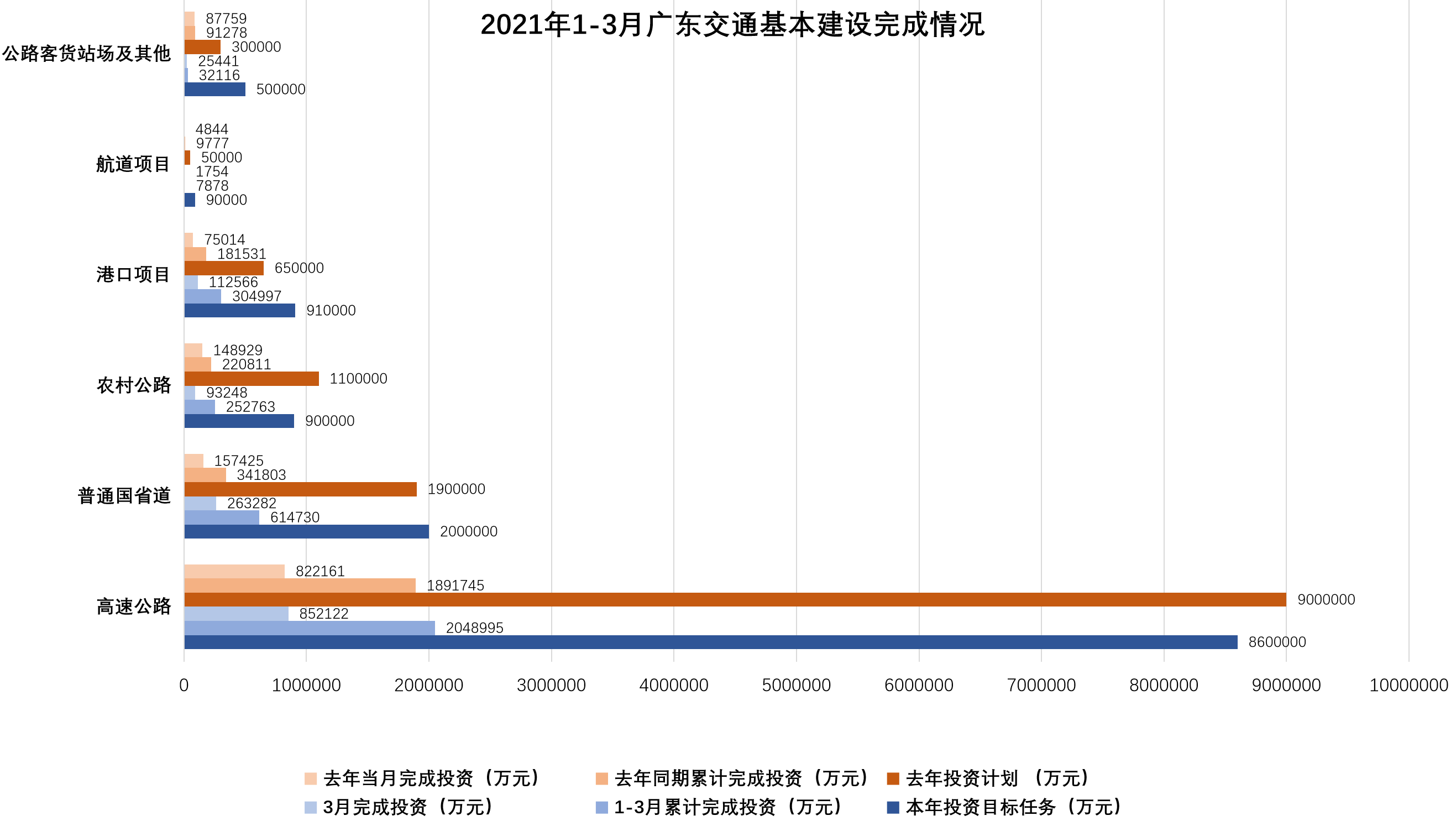 2021年一季度,广东省交通运输经济运行总体开局良好。主要指标如交通投资、货运量、港口货物吞吐量实现快速增长,公路、港口、航道等项目建设进展顺利,为全年投资目标任务的顺利实现、“十四五”交通工作“开门红”奠定了坚实基础。