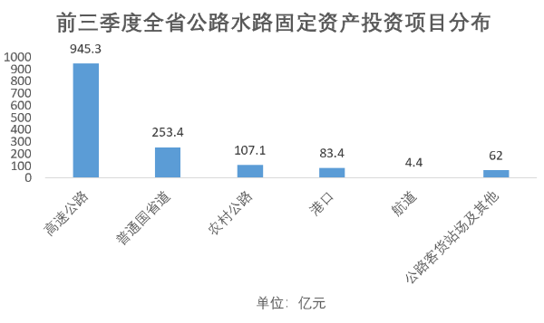 其中,高速公路、普通国省道实现较快增长,分别完成投资945.3亿元和253.4亿元,同比增长7.5%和增长44.5%,为年计划的78.8%和83.1%;