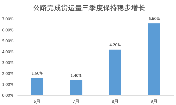 公路完成货运量15.7亿吨,同比下降8.4%,其中三季度增长4.1%,月度增速自6月以来连续4个月保持稳步增长,分别增长1.6%、1.4%、4.2%和6.6%。