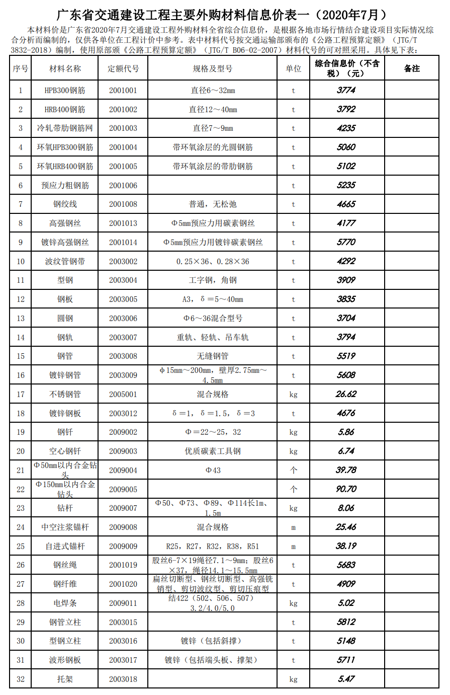 广东省交通建设工程主要外购材料信息价表一(2020年7月)