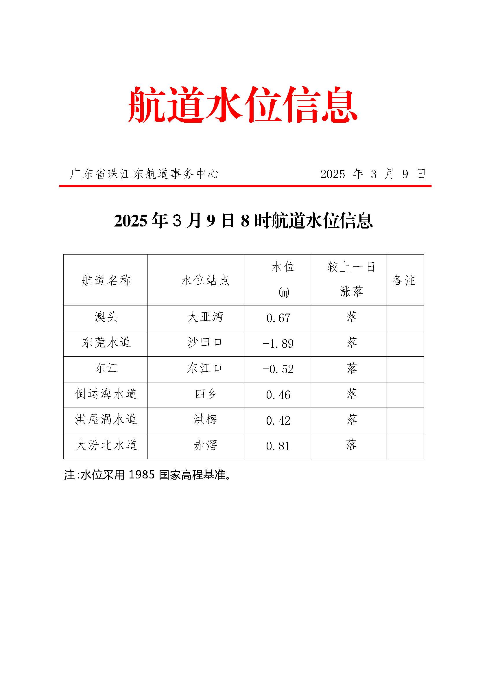 广东省珠江东航道事务中心2025年3月9日航道水位信息