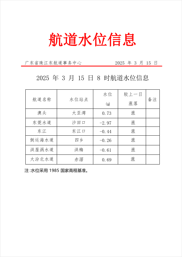 广东省珠江东航道事务中心2025年3月15日航道水位信息
