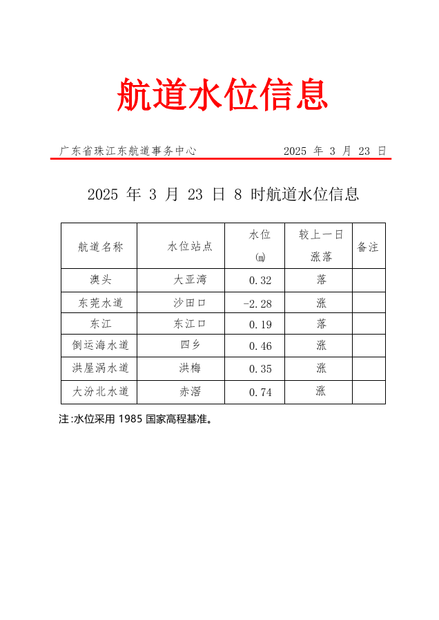广东省珠江东航道事务中心2025年3月23日航道水位信息