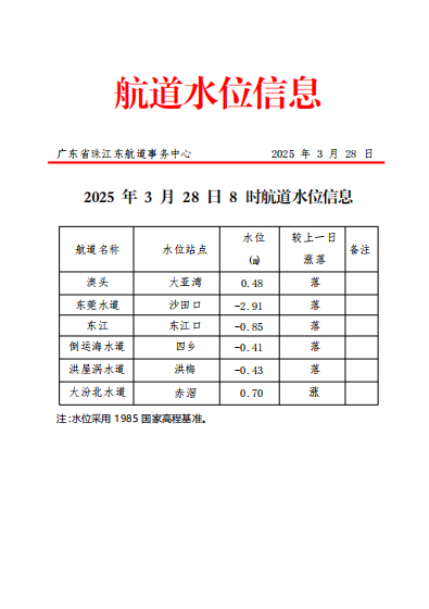 广东省珠江东航道事务中心2025年3月28日航道水位信息
