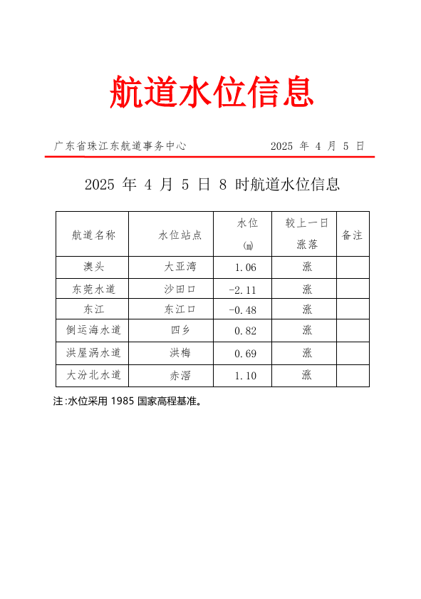广东省珠江东航道事务中心2025年4月5日航道水位信息