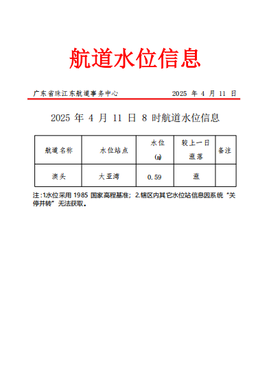 广东省珠江东航道事务中心2025年4月11日航道水位信息