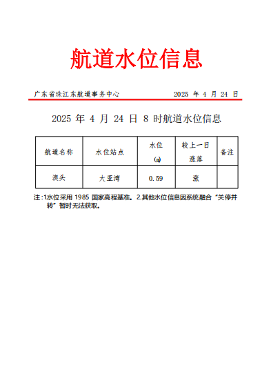广东省珠江东航道事务中心2025年4月24日航道水位信息