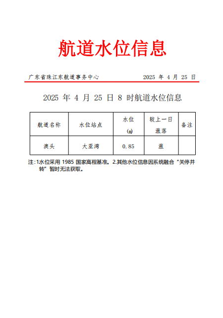 广东省珠江东航道事务中心2025年4月25日航道水位信息